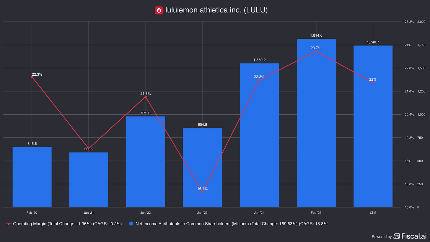 Adding it all up it’s easy to foresee how lululemon's operating margin (and, thus, profits) are coming under strain. Although historically quite healthy, they dropped to 17% for Q3 2025.
