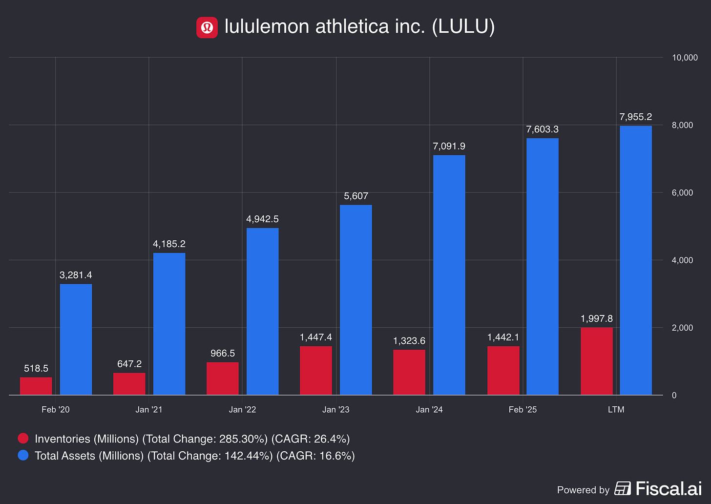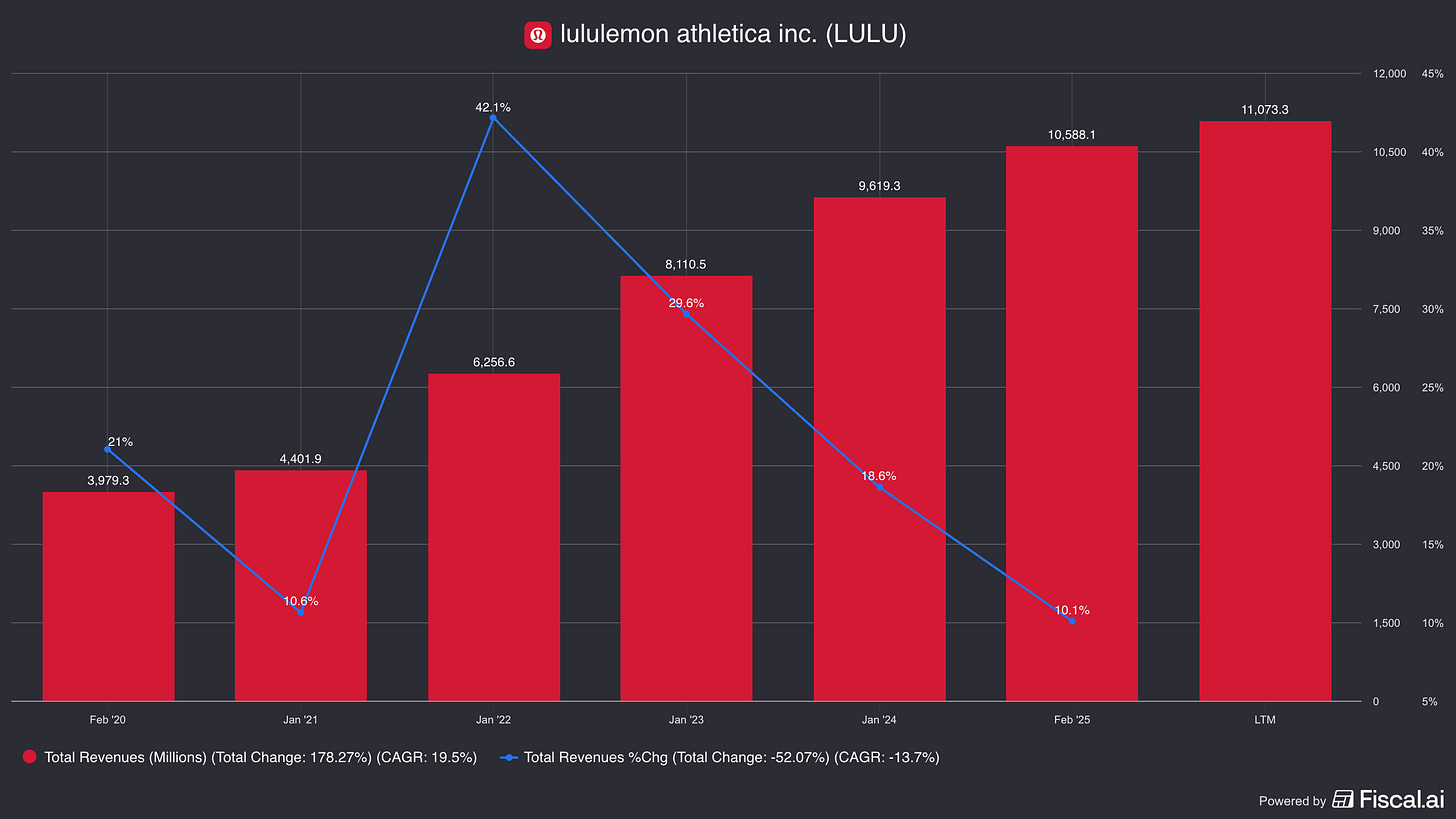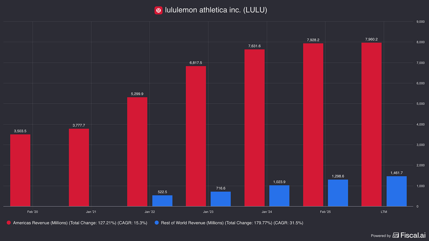 Although most of their stores are within the United States, lululemon has been aggressively investing in a mainland China expansion, going from zero stores in 2016 to 165 stores nearly a decade later.