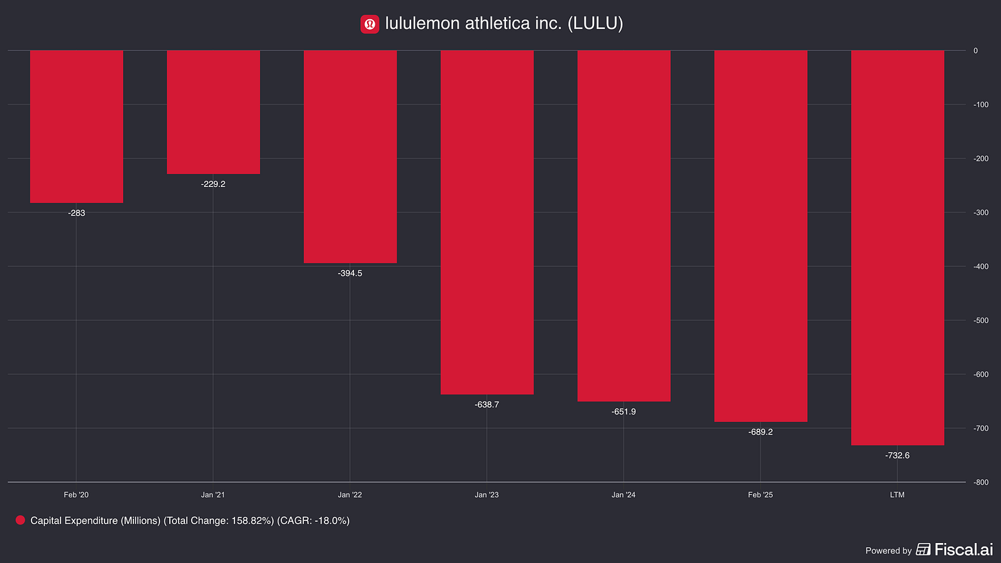 Usually, retail CapEx is synonymous with new store openings. For lululemon, the narrative is more nuanced. CapEx has scaled from $229 million in FY2020 to $689 million in FY2024.