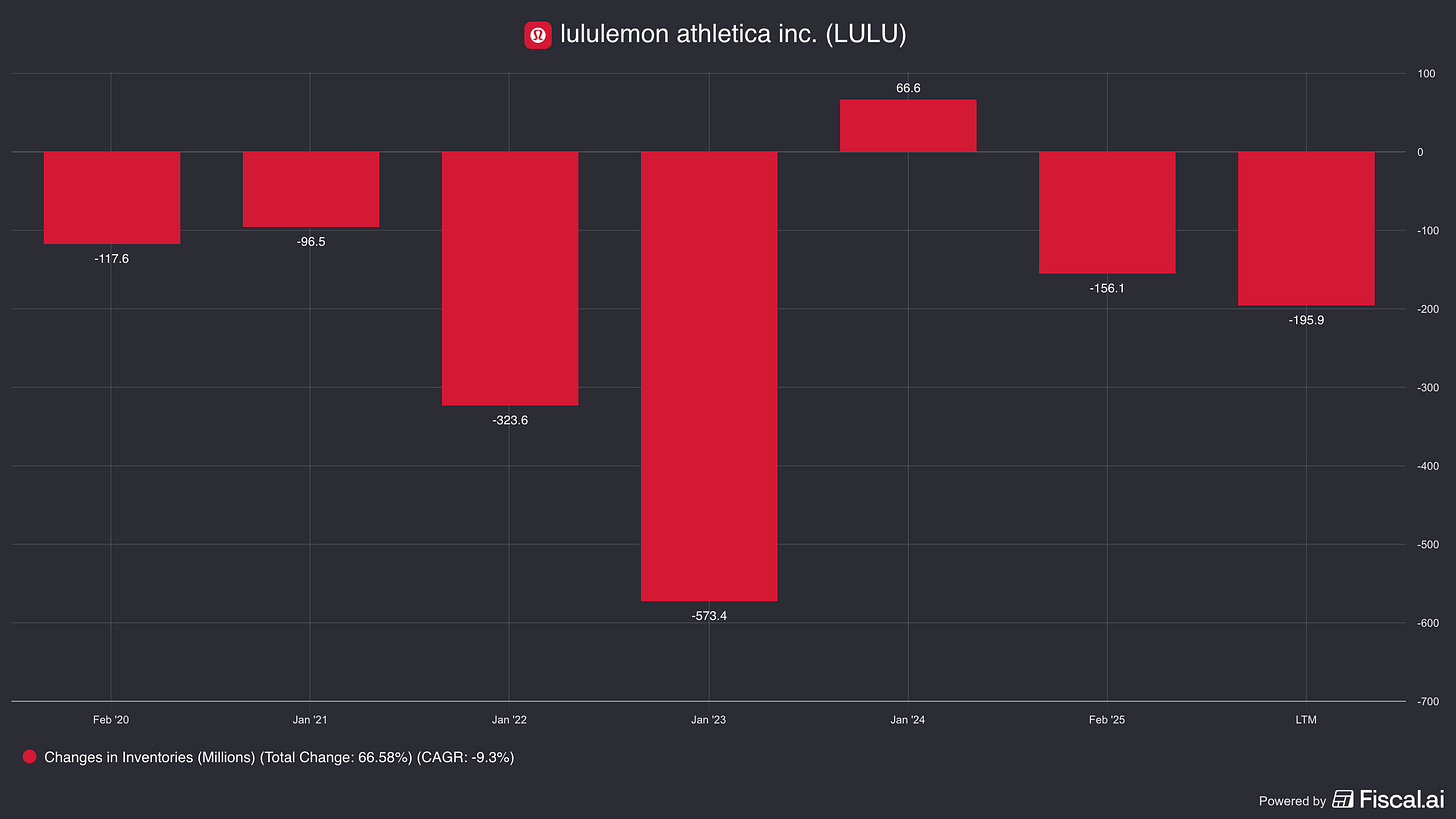 Over the last five years lululemon’s operating cash flow (OCF) has been highly volatile. Much of this relates to the initial supply chain and inventory shocks of the initial pandemic,