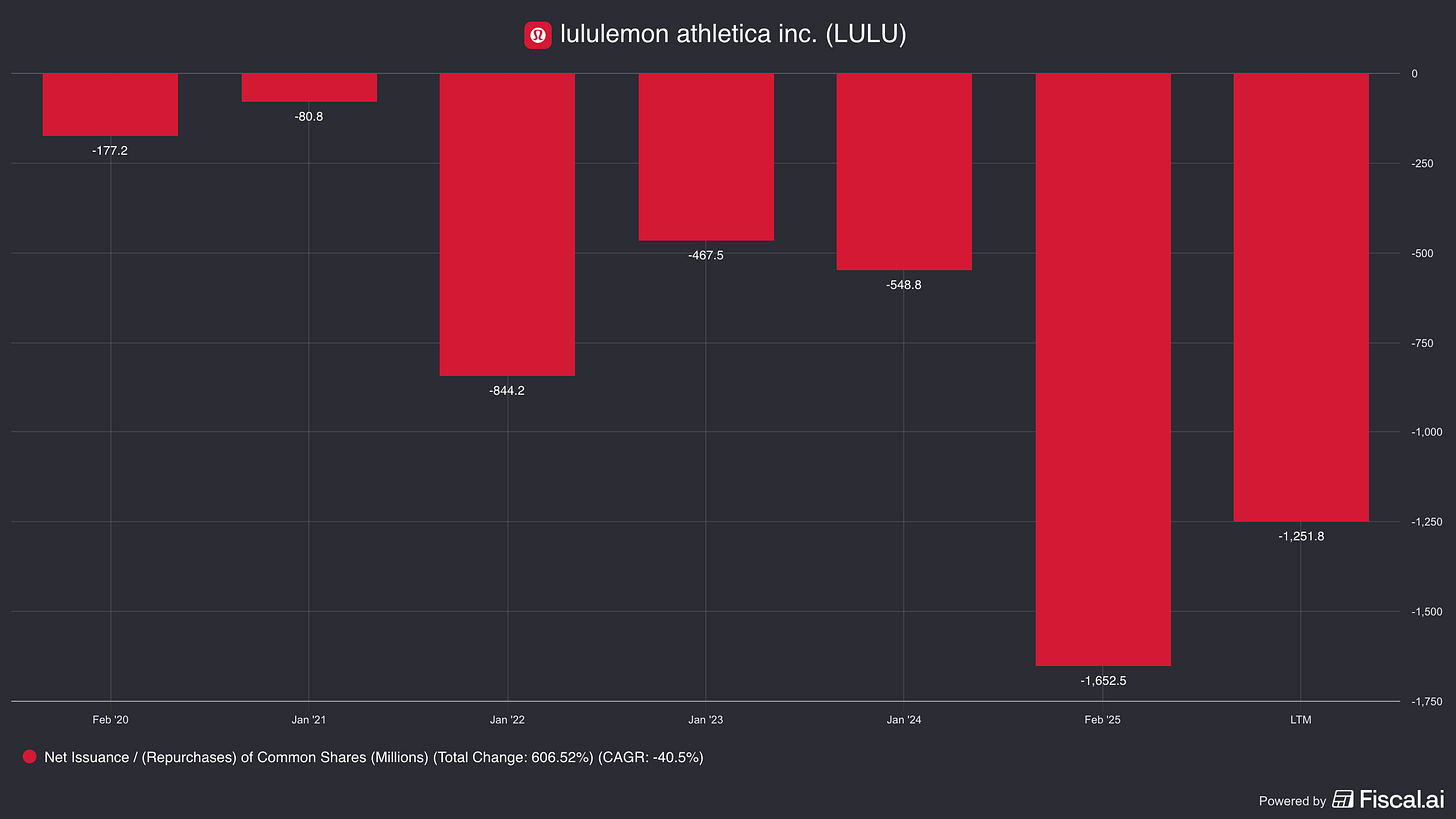 While historically the company retained cash, it is now spending to reduce the share count, repurchasing 5.1 million shares in 2024 alone. As of the last twelve months lululemon has been directing ~2/3 of its operating cash flow towards share repurchases.