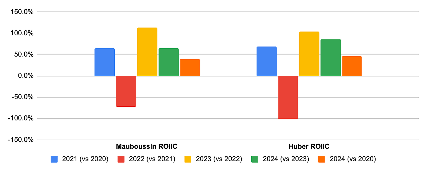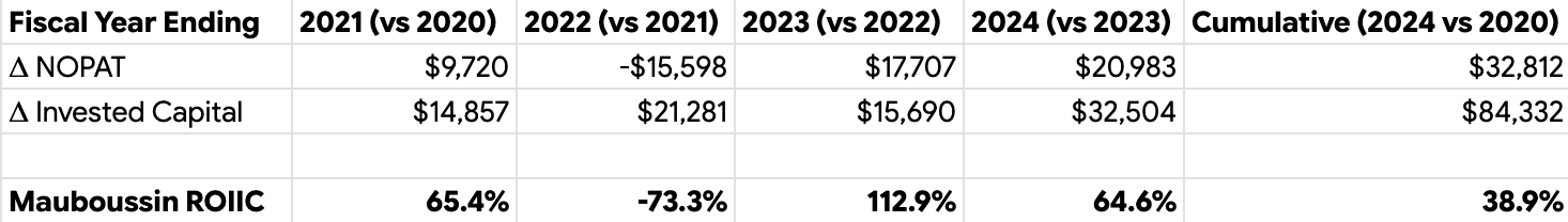 Let’s go one step further and calculate the ROIIC according to Mauboussin’s framework.