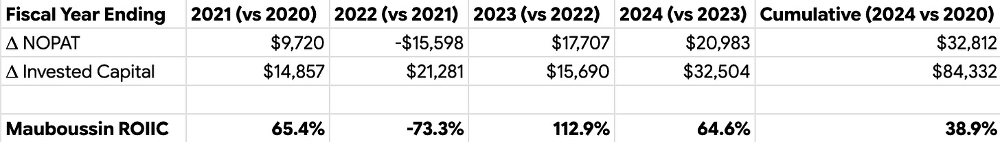 Over the entire period (2020-2024) Meta, however, generated nearly $33 billion in new cash profit on $84 billion of invested capital, at an ROIIC of nearly 39%.