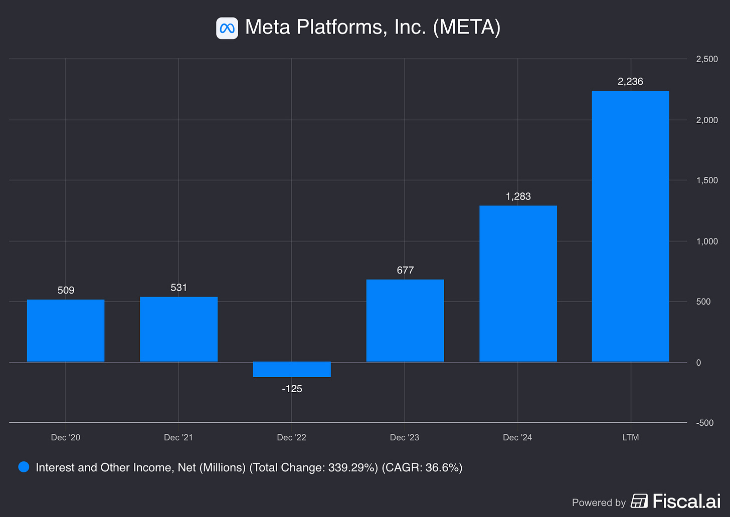 Huber’s use of Net Income captures the benefit of Meta’s fortress balance sheet. In 2023 and 2024, interest rates surged. Meta, holding roughly $70+ billion in cash and marketable securities, generated substantial Interest Income.