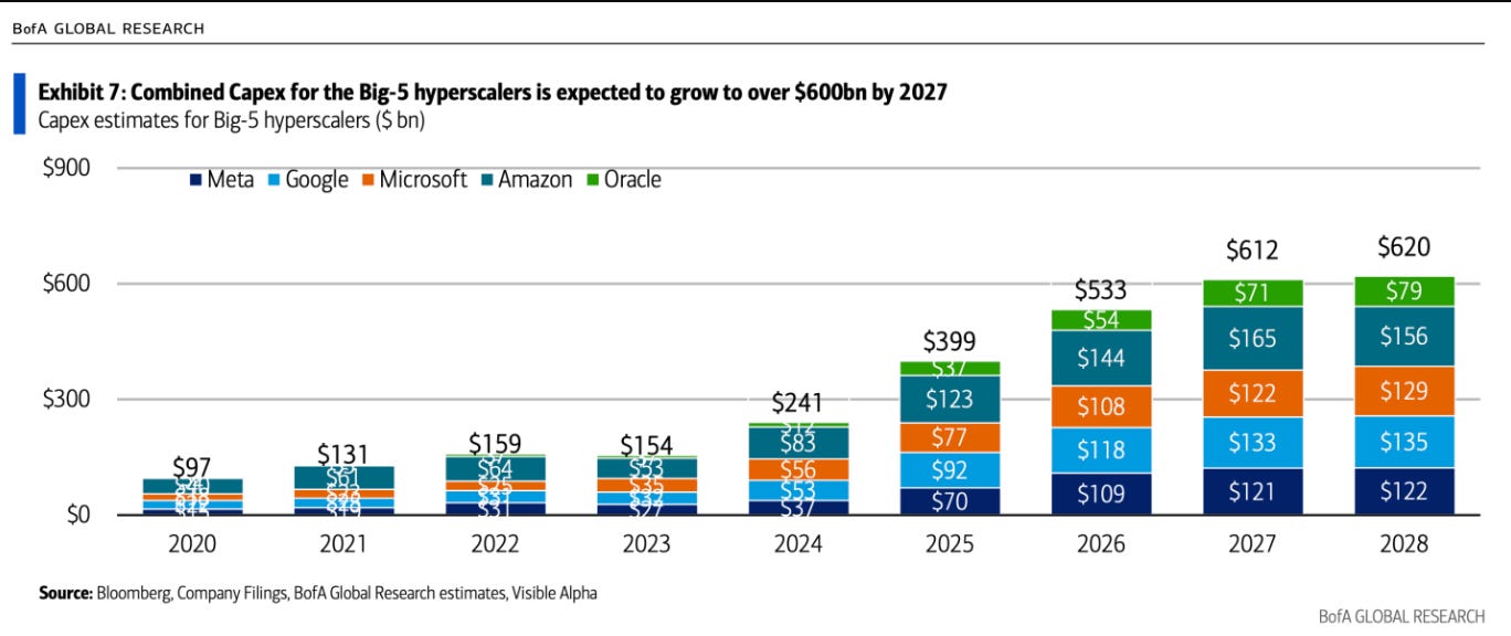 A hot topic among investors in recent years has been the return on AI investments at the hyper-scalers in the S&P 500. Not only have AI investments been growing at a rapid clip, but they are expected to continue to grow into 2027.