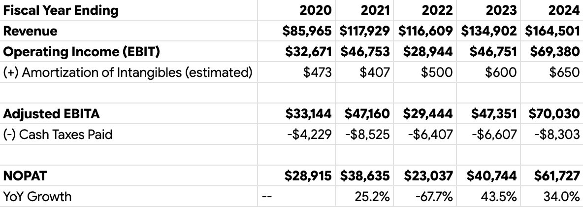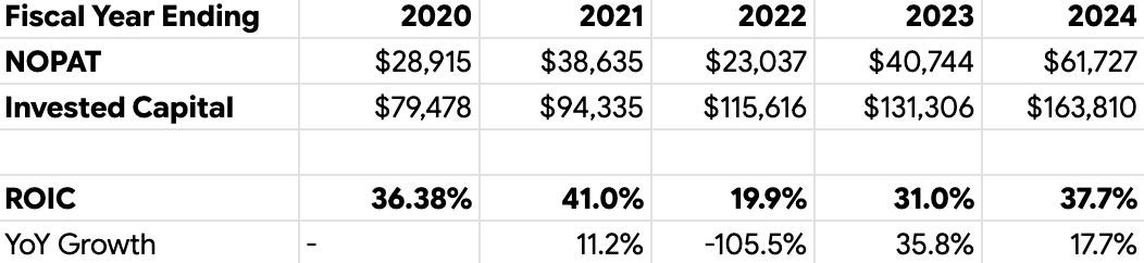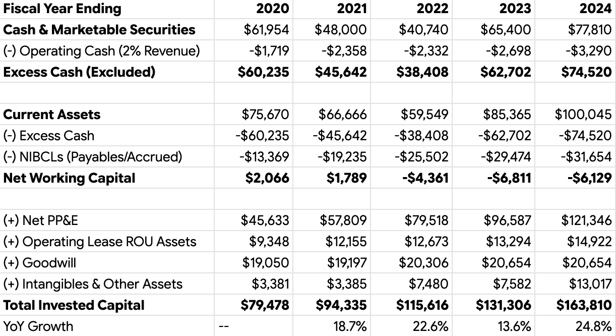 The Invested Capital base expanded from $79.5 billion in 2020 to $163.8 billion in 2024, even after stripping out the non-operating assets and adding back PP&E, Operating Leases, Goodwill, and Intangibles.