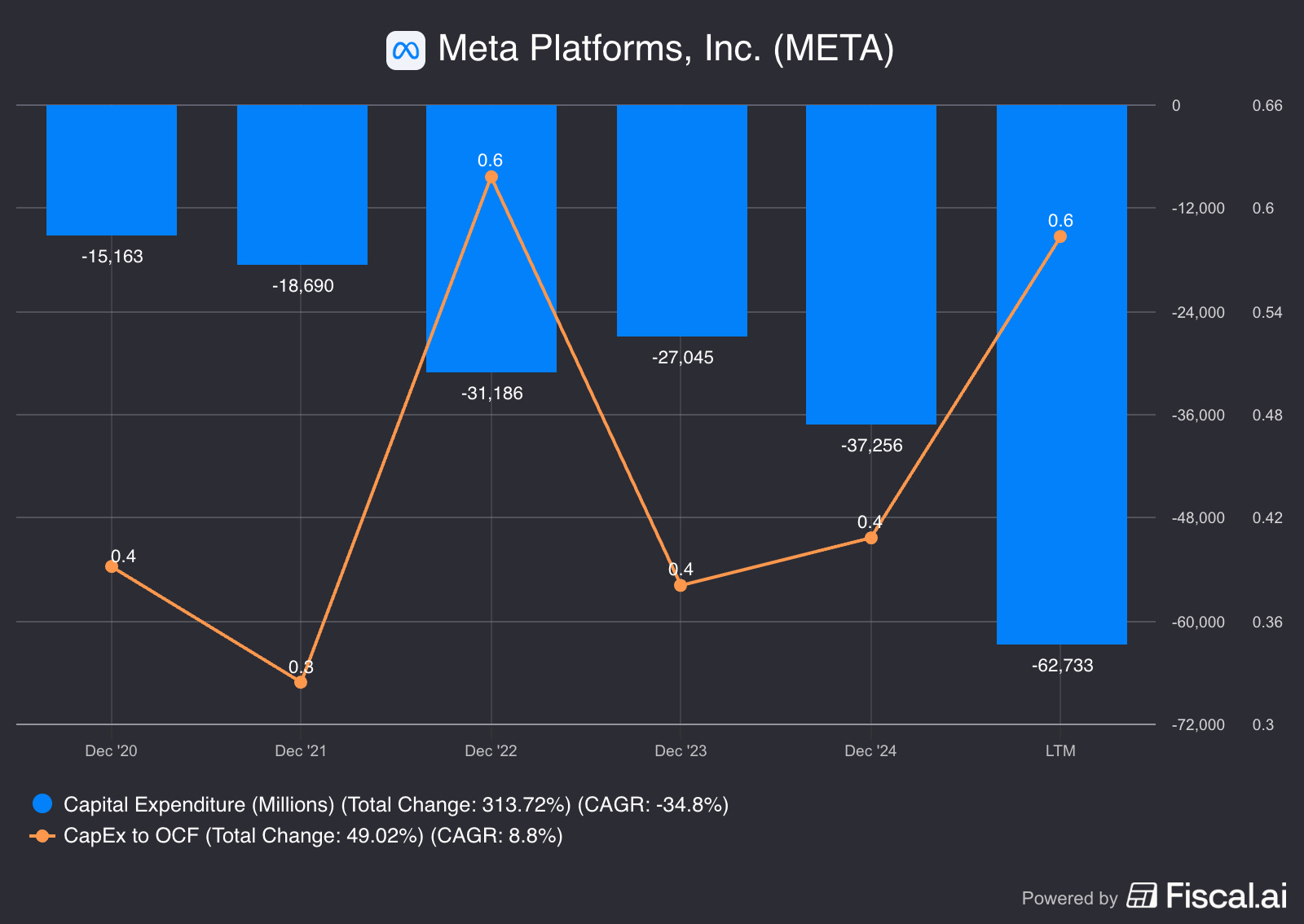 Over the past five years, Meta’s CapEx has already grown at nearly 35% annualized, while becoming an increasingly larger part of its Operating Cash Flow.