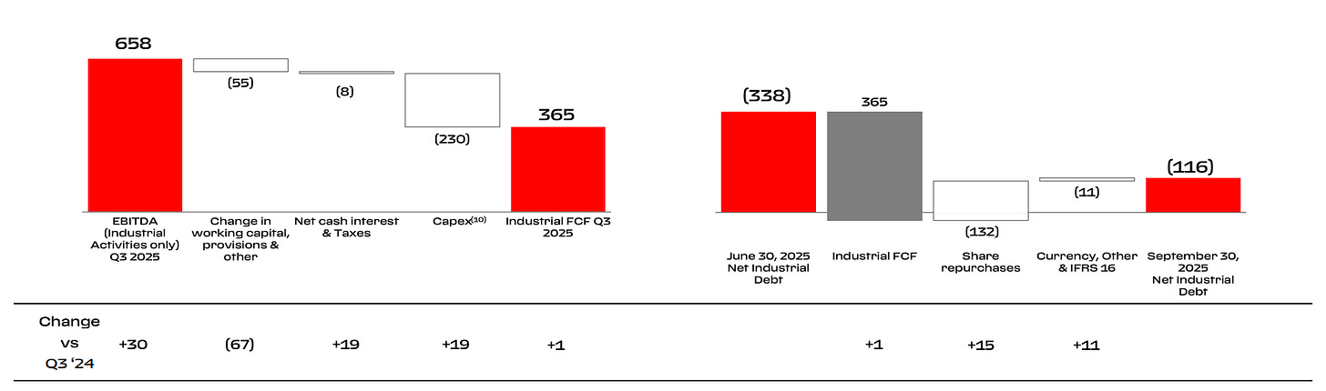 Strong Cash Generation: Industrial Free Cash Flow (I-FCF) generation was r €365 million in Q3, and relatively flat year over year. Ferrari continues to reinvest in their business, with €230 million of capex in the quarter. They continue to reward shareholders with ongoing buybacks, spending €132 million on repurchases.