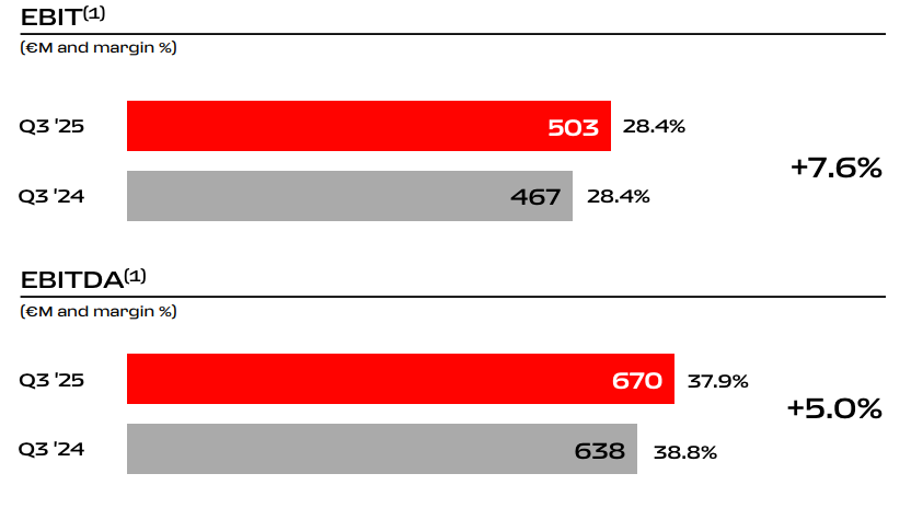 Exceptional Margins: Q3 Adjusted EBITDA reached €670 million, translating to a powerful 37.9% margin. This remains one of the highest profitability metrics in the entire global luxury and automotive landscape, validating the economic returns discussed in our initial analysis. Operating Profit (EBIT) grew 7.6% year-over-year to €503 million, achieving a 28.4% margin.